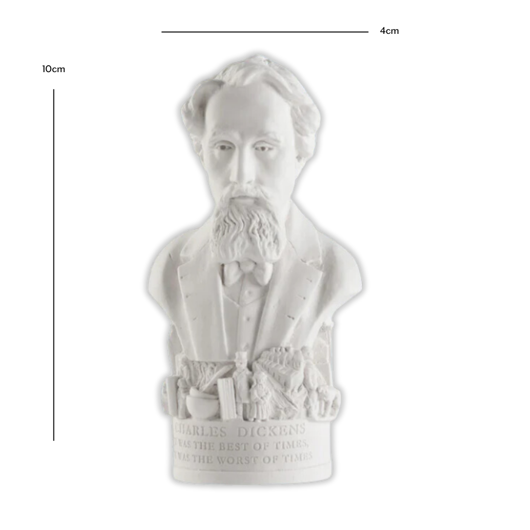 Elevate your desk with a must-have bust honoring the beloved author, Charles Dickens. Adorned with intricate plaster details inspired by his iconic literary works and engraved with the timeless quote: 'Charles Dickens, It was the best of times, It was the worst of times.' This exquisite bust showcases superior British craftsmanship, meticulously handcrafted and expertly finished in British Gypsum plaster.