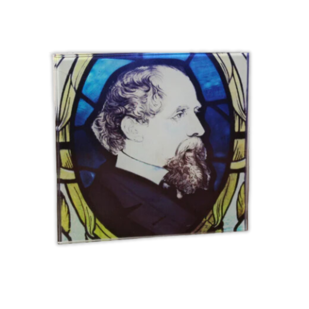 Discover a unique coaster showcasing a fragment of a historic stained glass window, originally gifted to the Stockport Sunday School Branch of the Dickens Fellowship in 1909. This precious surviving piece portrays Charles Dickens in profile, possibly referencing a photograph by George Herbert Watkins.