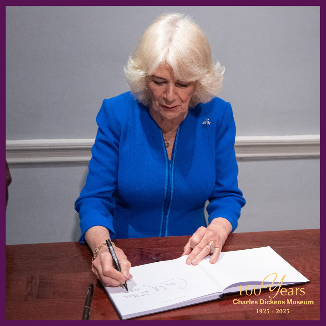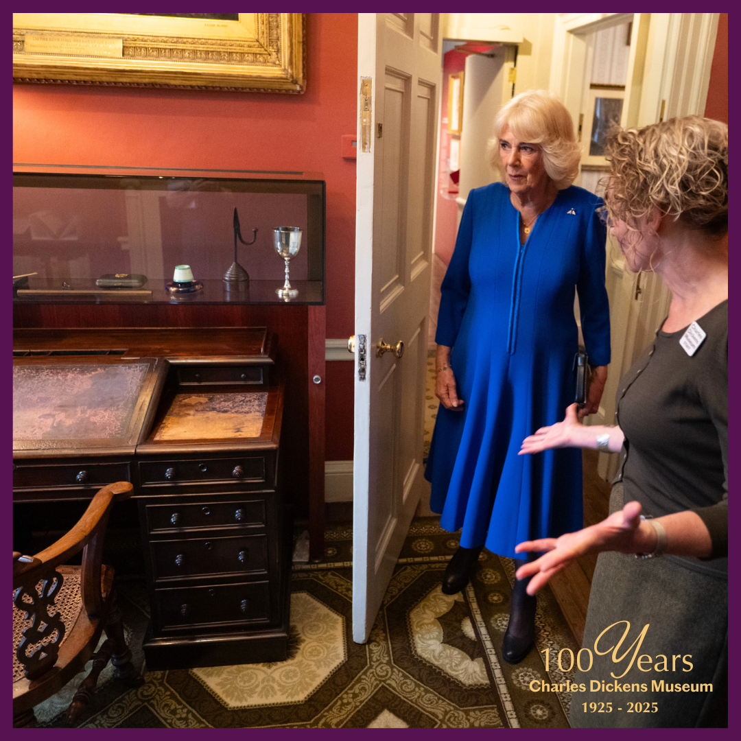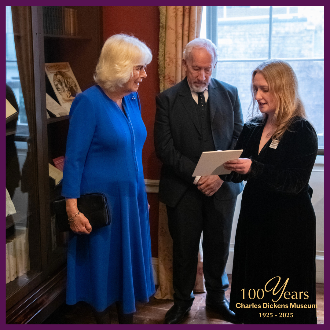 Queen Camilla visited the Charles Dickens Museum on 26th March 2025 to mark 100 years of the museum. She was greeted by our outgoing director Dr Cindy Sughrue and Mark Dickens, the current head of the Dickens family. Her Majesty toured the historic house and was introduced to Dr Frankie Kubicki, our newly appointed Museum Director as well as Patron and President of the Dickens Fellowship Lucinda Dickens Hawksley.